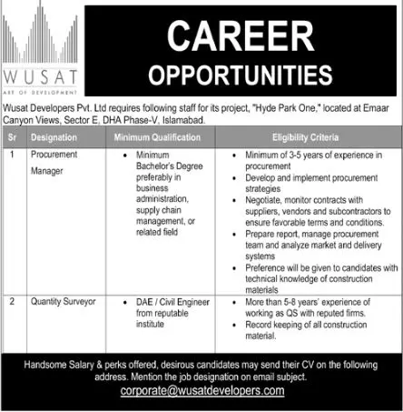 - Wusat Developers Pvt Ltd invites applications for job positions advertised in daily Jang dated 5 March 2023 for following vacancies in Islamabad, islamabad Islamabad Pakistan.