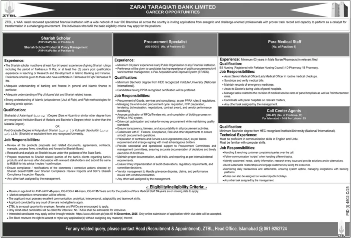 Zarai Taraqiati Bank Limited ZTBL Islamabad Jobs 2025 announce the Contract career opportunities for the post of See Below Ad in Federal, Islamabad for the fresh and experienced candidates on Contract basis who have Check Advertisement degree. Posted date of this post is 30/11/2025 and the last date is 14/12/2025. if you are eligible for this job apply before due date.