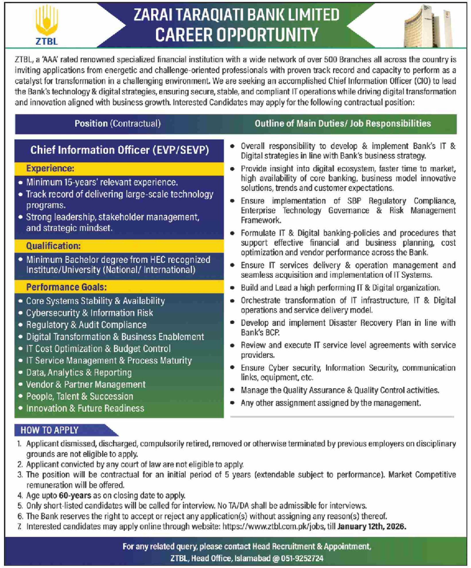 ZTBL, a 'AAA' rated renowned specialized financial institution with a wide network of over 500 Branches all across the country is inviting applications from energetic and challenge-oriented professionals with proven track record and capacity to perform as a catalyst for transformation in a challenging environment. We are seeking an accomplished Chief Information Officer (CIO) to lead the Bank's technology & digital strategies, ensuring secure, stable, and compliant IT operations while driving digital transformation and innovation aligned with business growth. Interested Candidates may apply for the following contractual position: