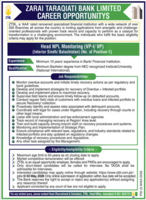 Zarai Taraqiati Bank Limited ZTBL Islamabad Jobs 2026 announce the Contract career opportunities for the post of See Below Ad in Federal, Islamabad for the fresh and experienced candidates on Contract basis who have Check Advertisement degree. Posted date of this post is 19/04/2026 and the last date is 03/05/2026. if you are eligible for this job apply before due date.