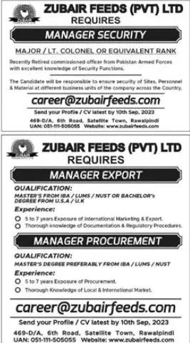 Zubair Feeds Private Limited Rawalpindi, rawalpindi Punjab Pakistan invites applications from eligible candidates for the post of manager export and manager procurement as per advertisement of August 27, 2023 published in daily Jang Newspaper.
